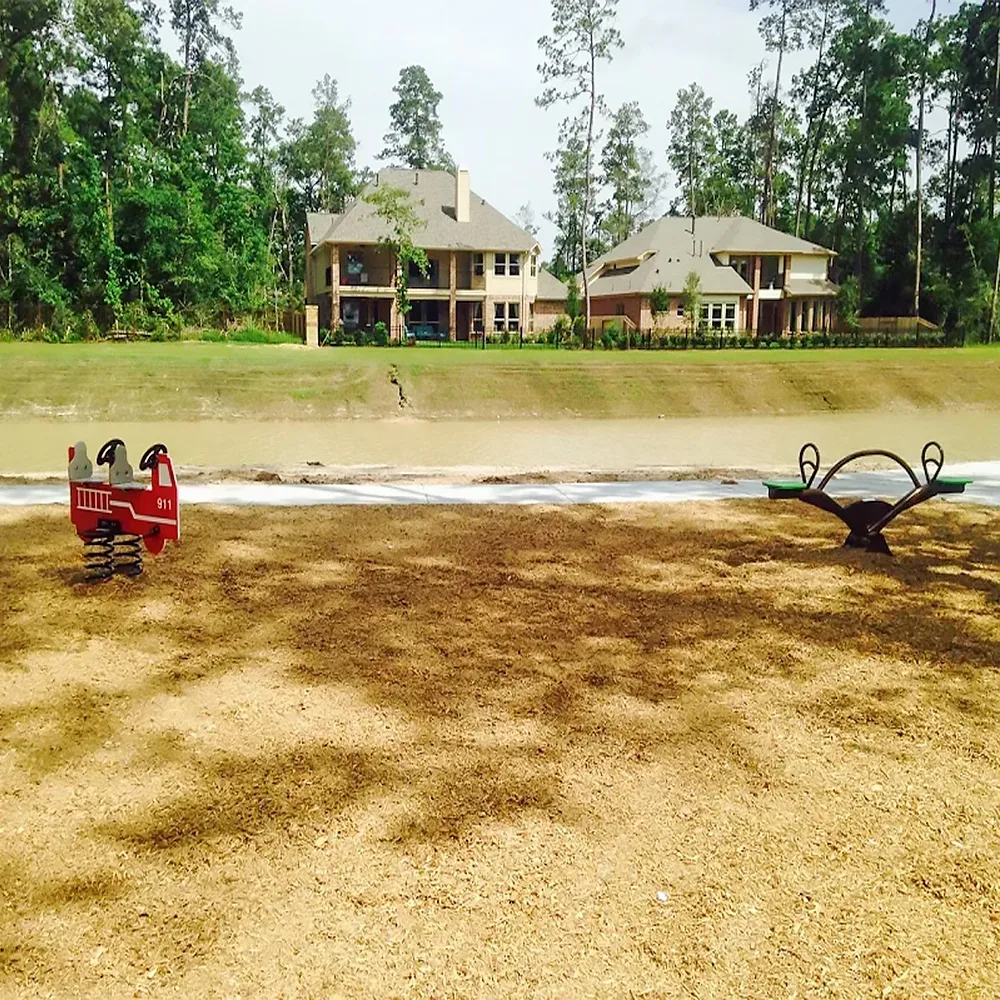 Meadows at Imperial Oaks Recreation Center Center in Conroe, Texas adds beautiful new outdoor play area and park swing! The Meadows at Imperial Oaks adds new playground equipment to their Recreation Center. The new swing set, teeter totters, and play structure in an earthy green tone make a fun addition to the beautiful park full of tall oak trees. The park is now a great place for the community to gather and enjoy the outdoors.